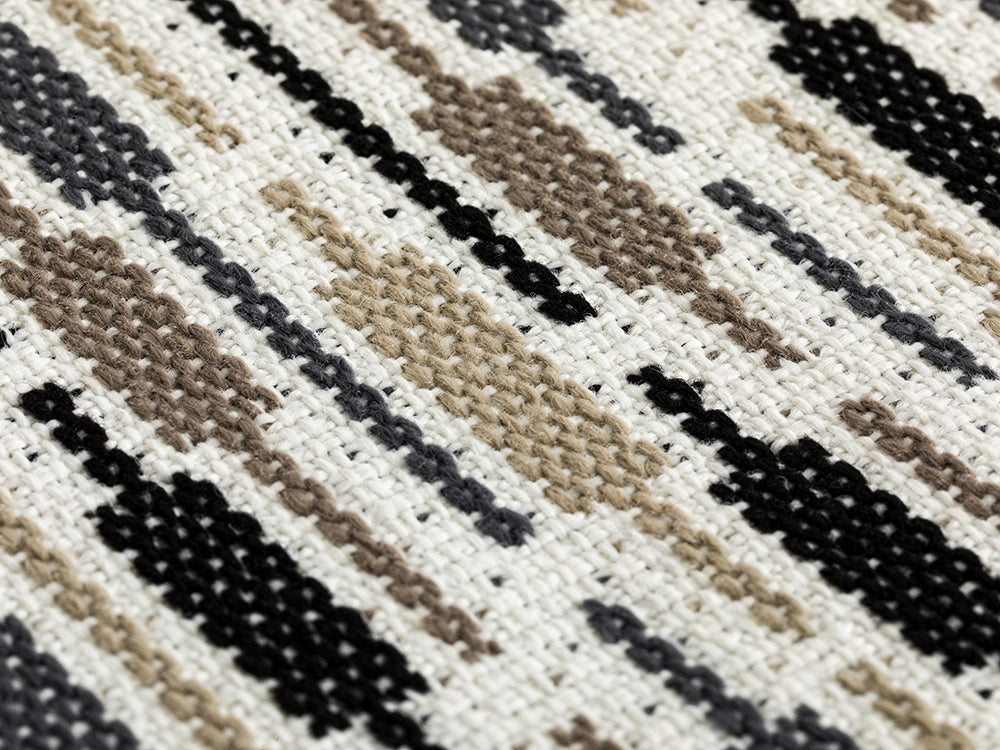 ✨ Black with dark gray, taupe, and beige stripes. Its bold design adds a modern edge to furniture. Fade-resistant and perfect for statement outdoor seating.