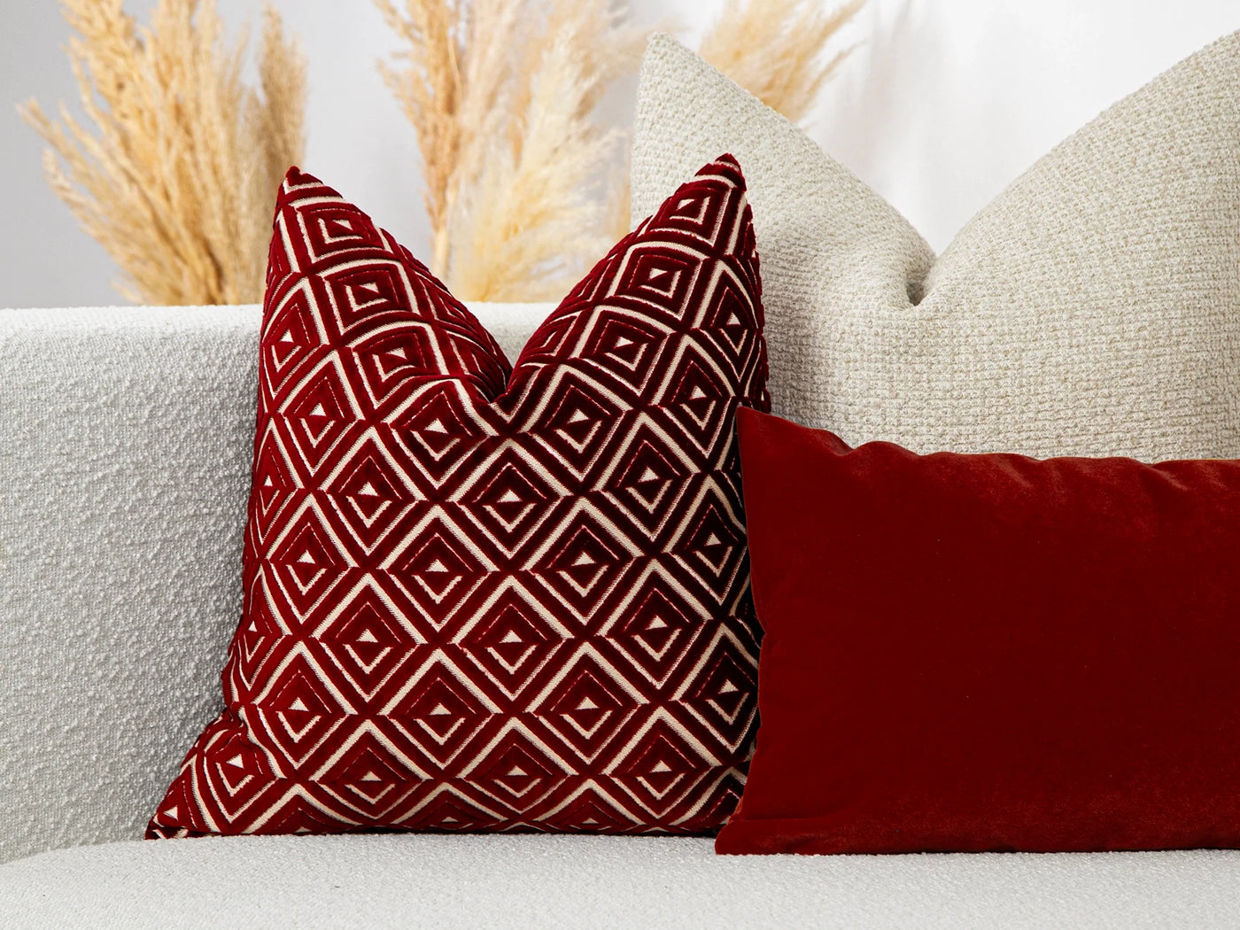 ✨ Elevate your space with the bold elegance of this burgundy geometric velvet pillow cover.