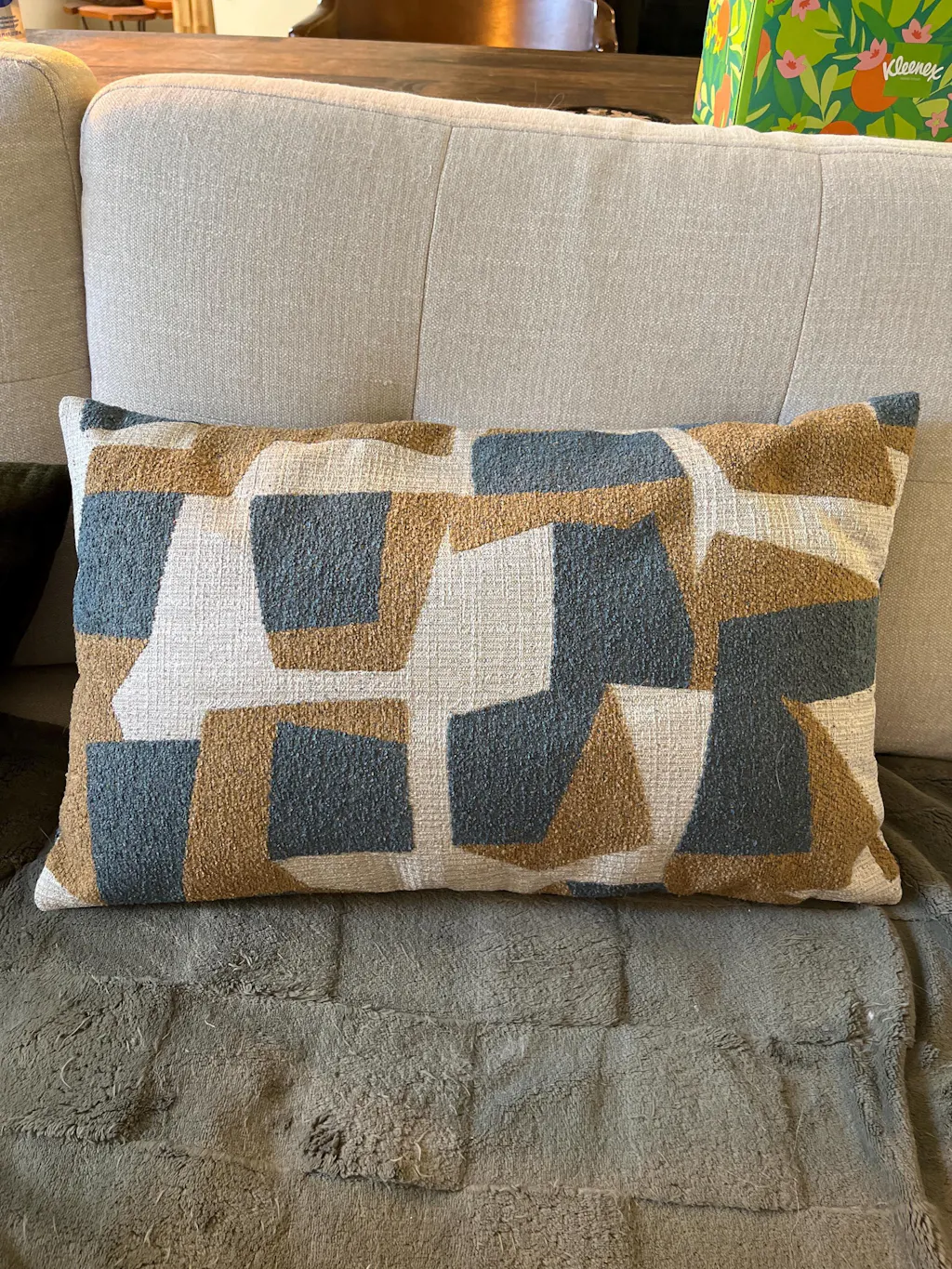✨ Featuring a structured geometric design, this pillow cover blends mustard with soft blue and ivory for colorful dimension.